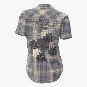 Guitar Company Plaid Shirt with Back Design Wear this plaid button down shirt with your favorite jeans and a cow-boy hat. Featured with front chest functional pockets, a yarn dye poplin, a delicate lace overlay on the chest pockets, pearlized snaps, and screen print graphic.
