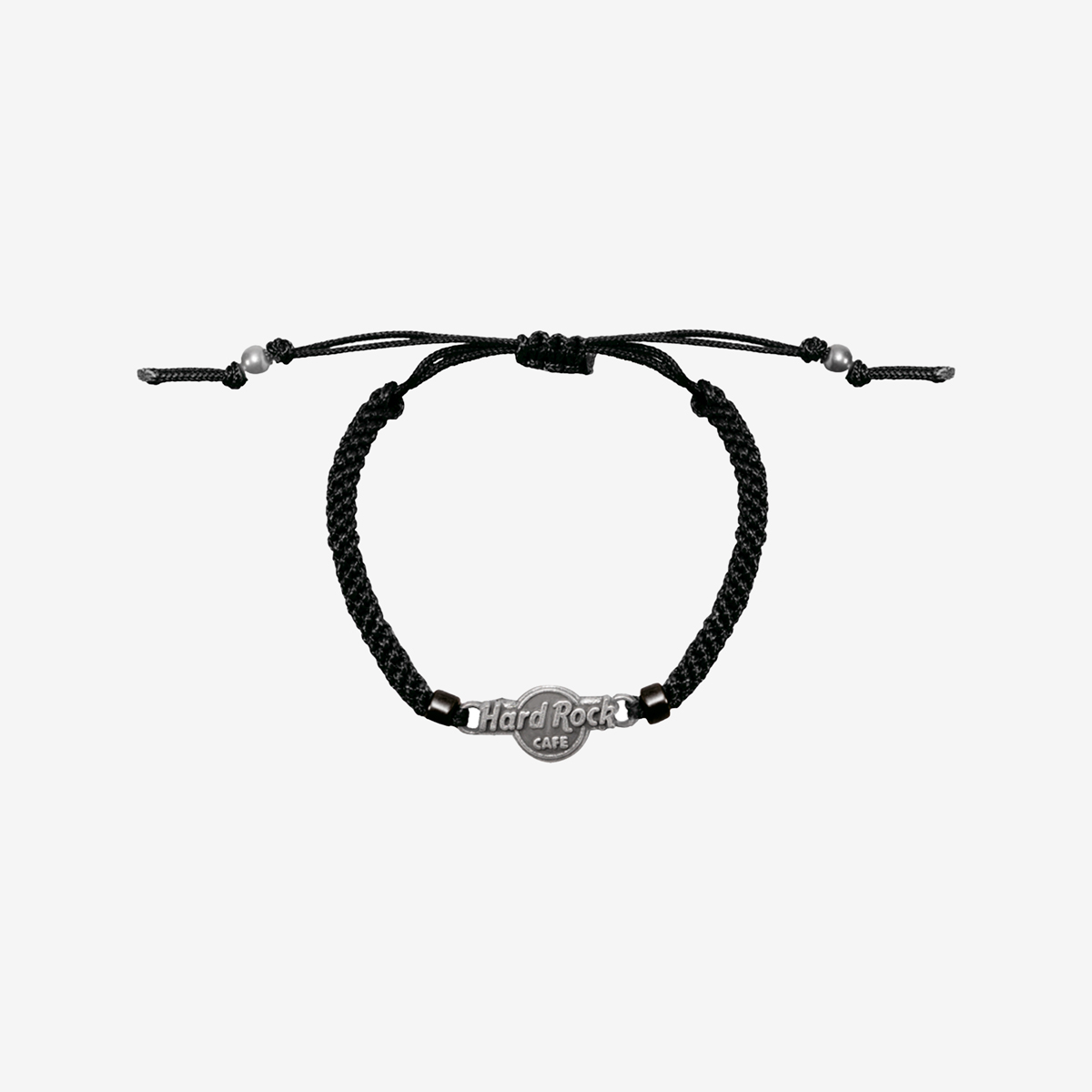 Black Braided Friendship Bracelet Beautifully braided, black Hard Rock logo friendship bracelet with easy adjustable pull-string closure. Lightweight zinc alloy Hard Rock logo charm and beads, available in both black and blue for men and women. Length extends 7in-10in to fit around most size wrists.