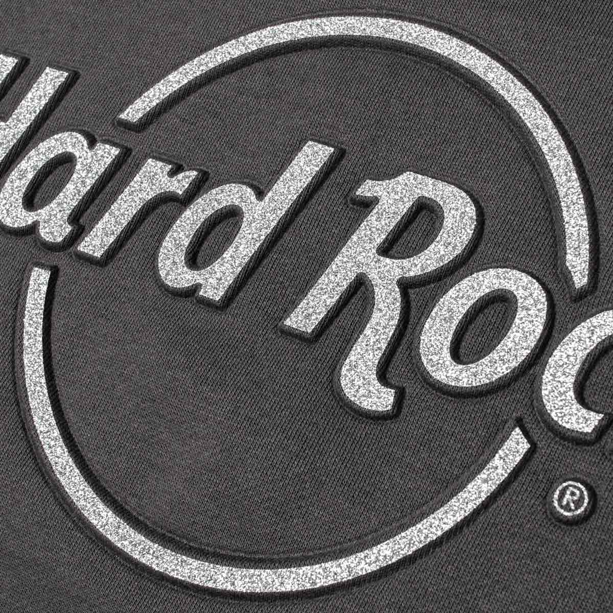 Glitter Logo French Terry Longsleeve Tee Nothing but love for this perfectly lined Hard Rock pullover longsleeve crewneck sweatshirt. Featuring a metallic Hard Rock logo that is 3D raised with silver glitter across the chest makes it spicy and elevated. Plus, it is french-terry lined for added warmth. Dress it up with suede leggings or your favorite pair of vintage jeans.