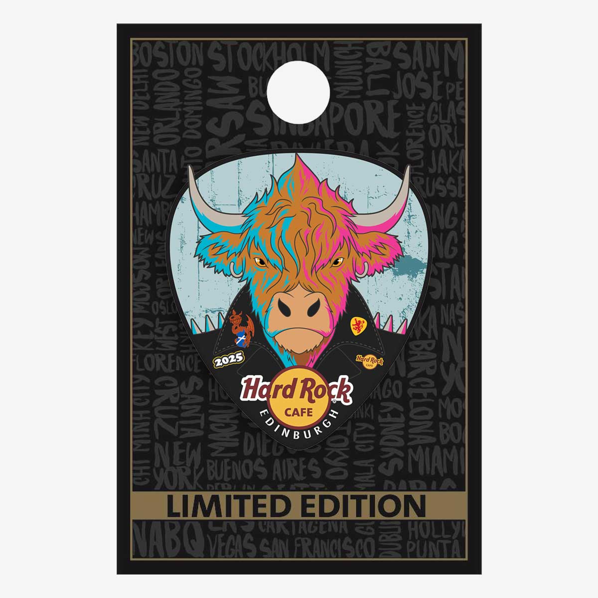 Unleash your inner rebel with the Limited Edition Highland Punk Pin from Hard Rock Cafe Edinburgh! Featuring a bold Highland cow in a leather jacket, this pick-shaped collectible combines traditional Scottish pride with Hard Rock’s style.