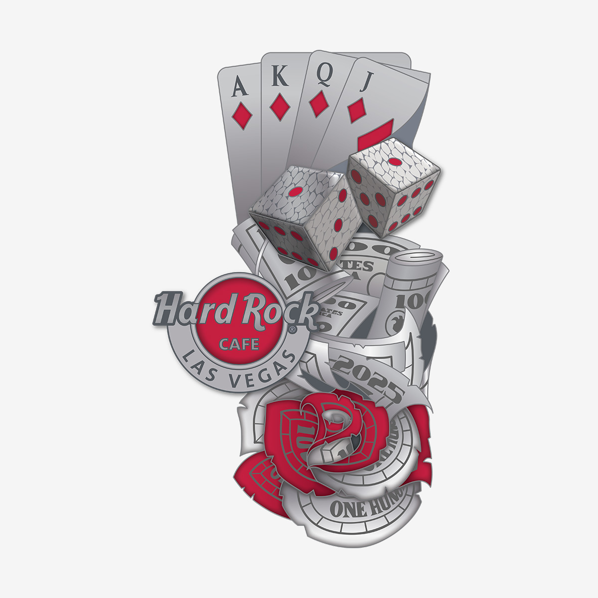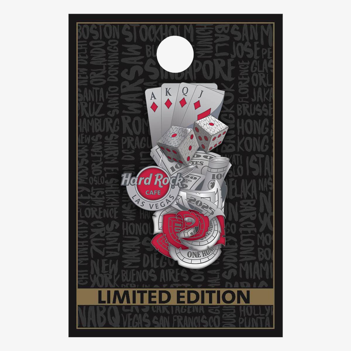 Stack the odds in your favor with the Hard Rock Limited Edition Las Vegas Poker Snake Pin, built to channel the rush of high-stakes nights at the Hard Rock Casino. A red snake winds through glittering “One Hundred” chips, translucent dice, and a sharp Ace-King hand—the kind of setup that defines a make-or-break play. Finished with the Hard Rock Cafe Las Vegas logo at the base, this design captures the thrill of the game at full volume. From the sculpted scales of the snake to the layered casino icons, each element is packed with tension and movement. It’s a visual flash of dice in motion, cards revealed, and chips clacking under the lights. Designed for collectors who appreciate the heat of the table and the impact of bold design, this pin stands out with unmistakable style. Whether you’re deep into the game or just getting dealt in, this one belongs in the lineup.
