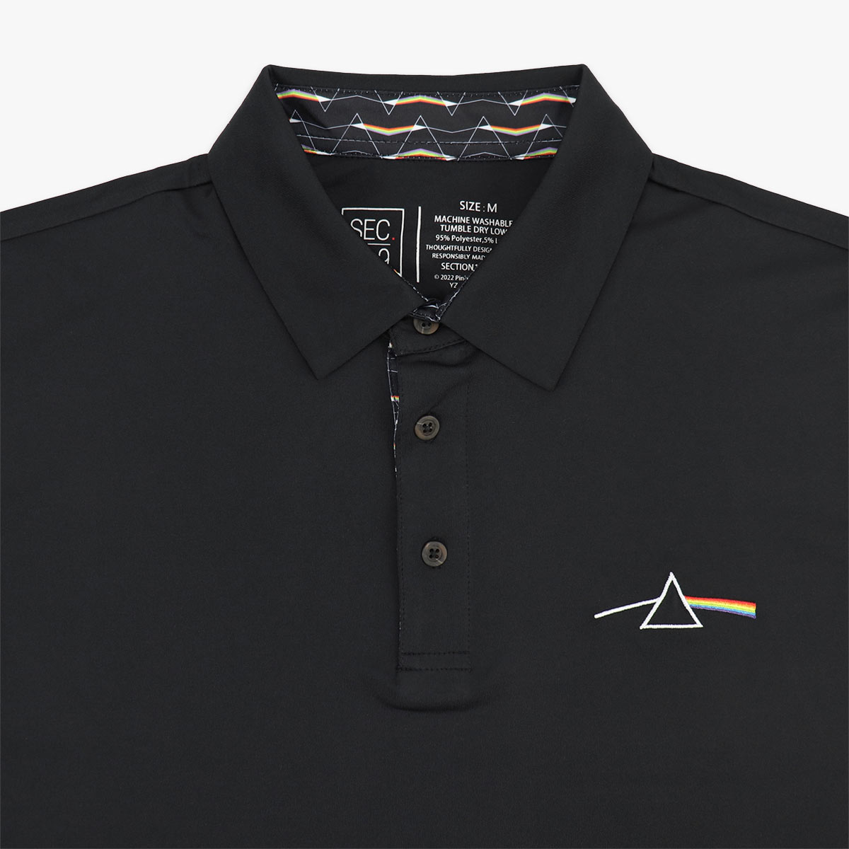 Pink Floyd Dark Side of the Moon Dry Fit Polo in Black Stay cool and comfortable on the course with this performance polo. This style is constructed from an innovative poly-blend fabric that features a moisture-wicking surface, four-way stretch, odor control, and easy-care. An exceptional gram weight in the fabric prevents torque during activity.The tasteful design of the Pink Floyd Dark Side of the Moon Dry Fit Polo is made with a blend of 95% Polyester 5% Lycra making it the coolest and most comfortable casual shirt on the planet.