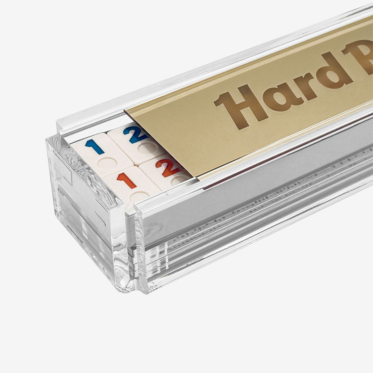 Classic game, high-end style. This rummy tile set features a flame-polished acrylic case with 106 tiles, including two jokers, all in a sleek gold mirror design.